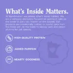 Sanglier, dinde, saumon, glycérine de noix de coco, arôme naturel, sel marin, citrouille biologique, vinaigre de cidre de pomme biologique, tocophérols (conservateur).